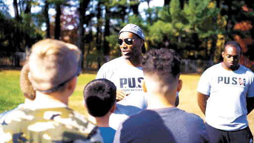 - Courtesy photo by HBZ Media Nashua’s Reggie Perry addresses his students during a P.U.S.H. training session. The organization is donating food to feed 115 needy families this week for Thanksgiving.