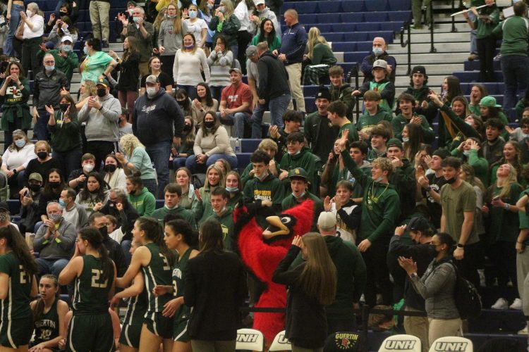 The Bishop Guertin girls basketball team begins to celebrate in the waning seconds of their Division I state title win Sunday in front of their fans at UNH’s Lundholm Gym. (Telegrapph photo by TOM KING)