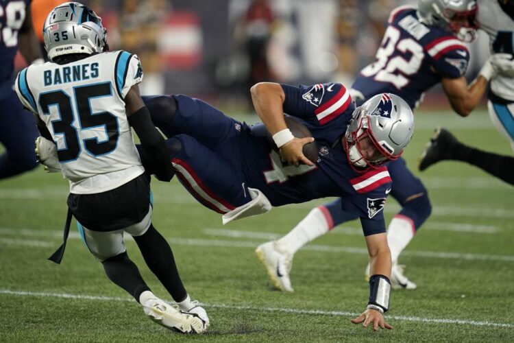 Carolina Panthers cornerback Kalon Barnes (35) brings down New England Patriots quarterback Bailey Zappe during the second half of Friday night’s preseason game at Gillette Stadium. (AP photo)