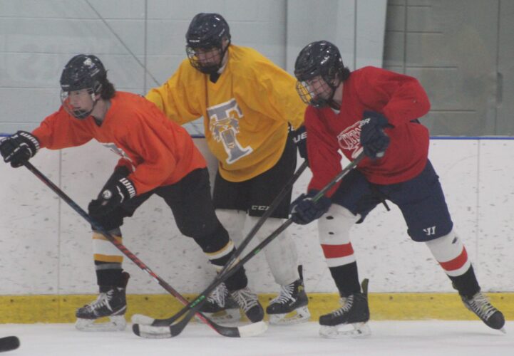 Skaters battle for the puck during the first practice of the season for North-Souhegan hockey at Conway Arena. (Telegraph photo by TOM KING)