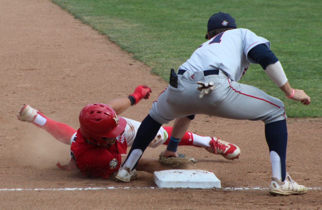 Telegraph photo by TOM KING Nashua's Troy Schreffler, Jr. takes third on a close play, just beating the tag by Brockton's Pat Roche during Sunday's 10-9 loss to the Rox at Holman Stadium.