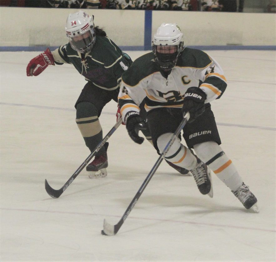 Bishop Guertin's Lindsay Hult carries the puck into the zone ahead of Brady-Trinity-West's Grace Orr during a game earlier this season at Hudson's Cyclones Arena. (Telegraph photo by TOM KING)