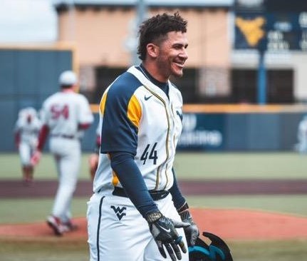 Former Souhegan standout Alec Burns is all smiles after he hit two home runs in the first game of a doubleheader for West Virginia vs. Oklahoma on Saturday. (Twtter photo)