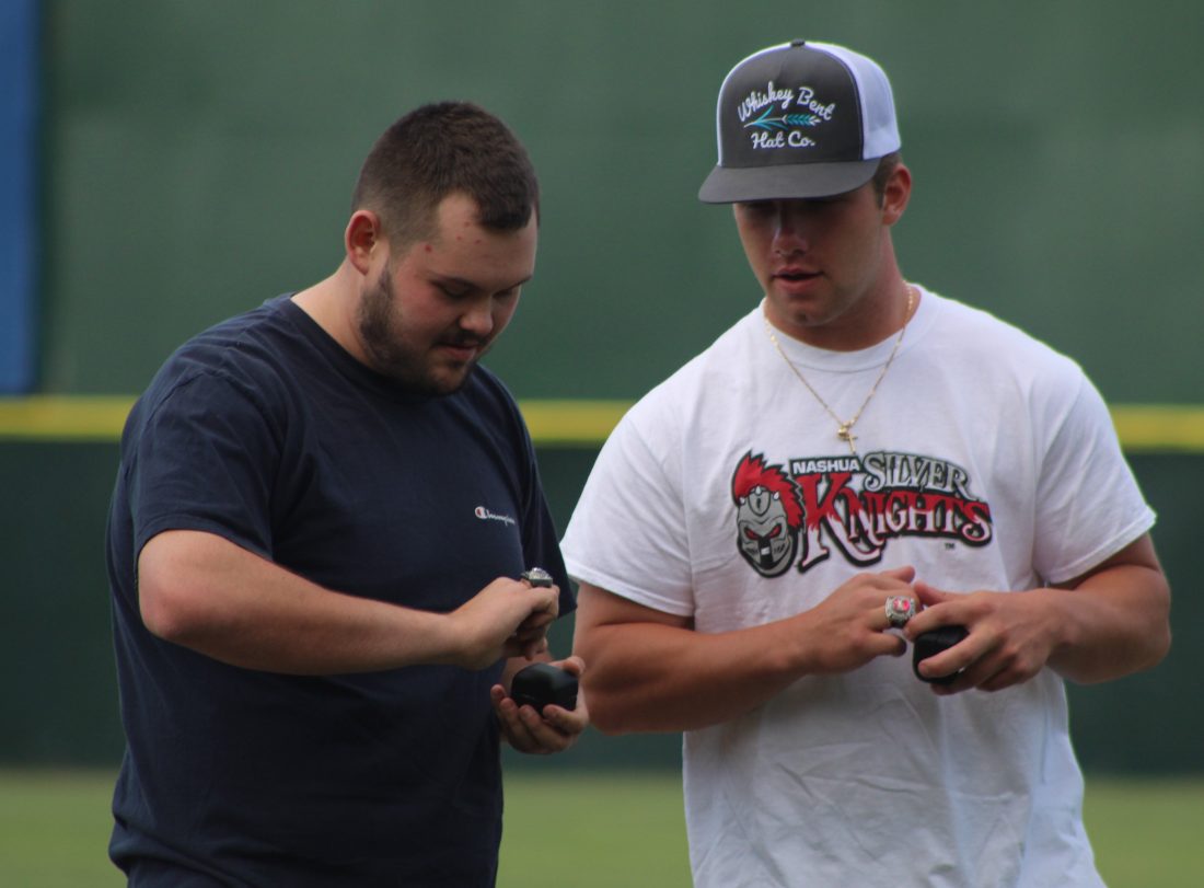 Former Nashua Silver Knights Kyle Bouchard, left, and Brett Anderson admire their 2020 FCBL championship rings during the pre-game ring ceremony at Thursday night's Nashua opener at Holman Stadium. (Telegraph photo by TOM KING)