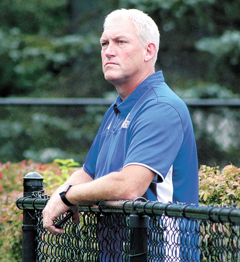 Johnson & Wales University women's soccer coach Chris Flint, a Bishop Guertin alum, checks out some of the local high school talent at Stellos Stadium. Flint's team will be at Rivier in a GNAC contest next weekend. (Telegraph photo by TOM KING)