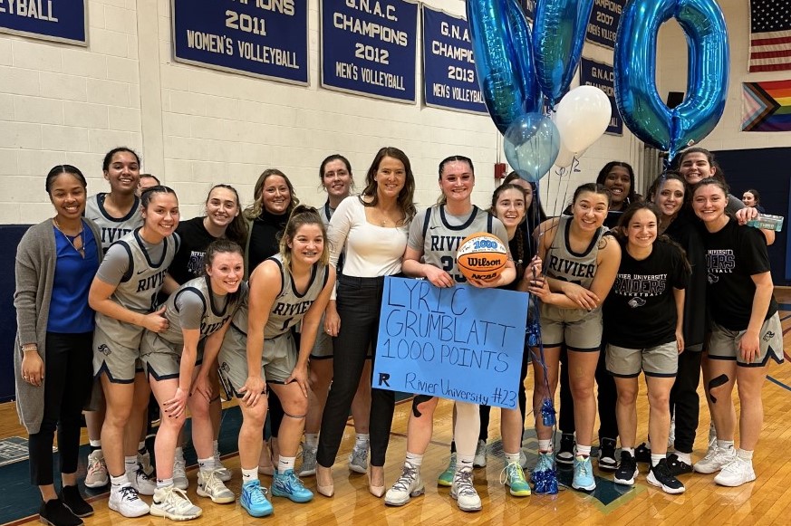 The Raiders celebrated Lyric Grumblatt's 1,000th career point on Saturday. (Photo courtesy of Rivier University)