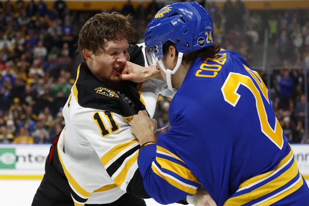 Boston Bruins center Trent Frederic (11) and Buffalo Sabres center Dylan Cozens (24) fight during the second period of Sunday's game in Buffalo. (AP photo)