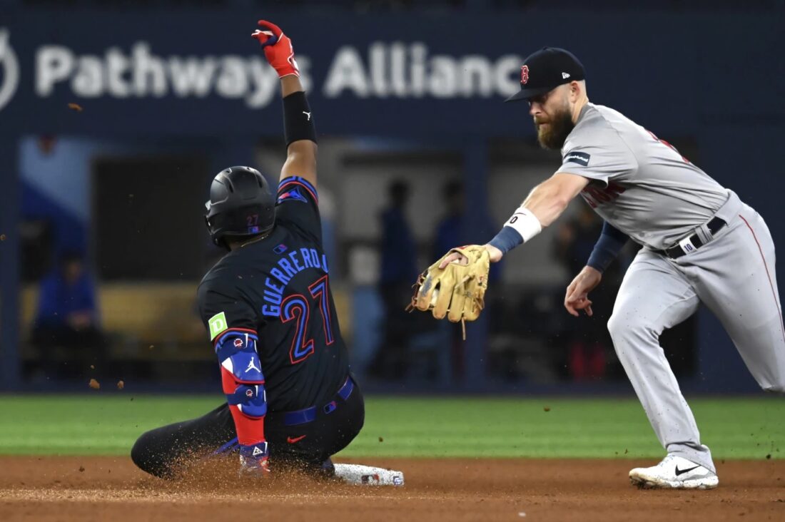 Vladimir Guerrero, Jr. slides in safely at second for the Blue Jays, ahead of any tag attempt by Red Sox shortstop Trevor Story during Wednesday night's game in Toronto. (AP photo)