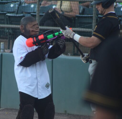 Monkey Boy zaps New Britain’s Jared Clark during Friday night’s FCBL game at Holman Stadium. (Telegraph photo by TOM KING)