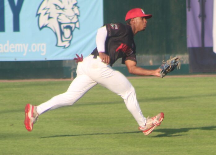 Silver Knights left fielder Matt Jackson makes a charging catch of a line drive during Thursday night’s FCBL game vs.Vermont at Holman Stadiium. (Telegraph photo by TOM KING)