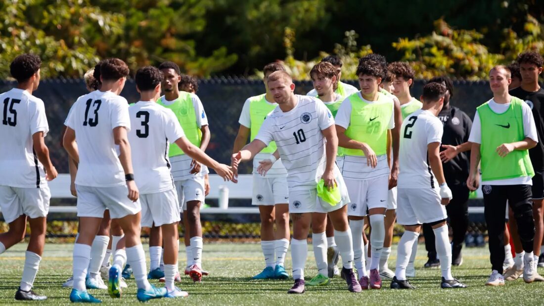 The Raiders men's soccer team had to settle for a 2-2 tie Saturday with Saint Joseph's in West Hartford, Conn. (Photo courtesy of Rivier Athletics)
