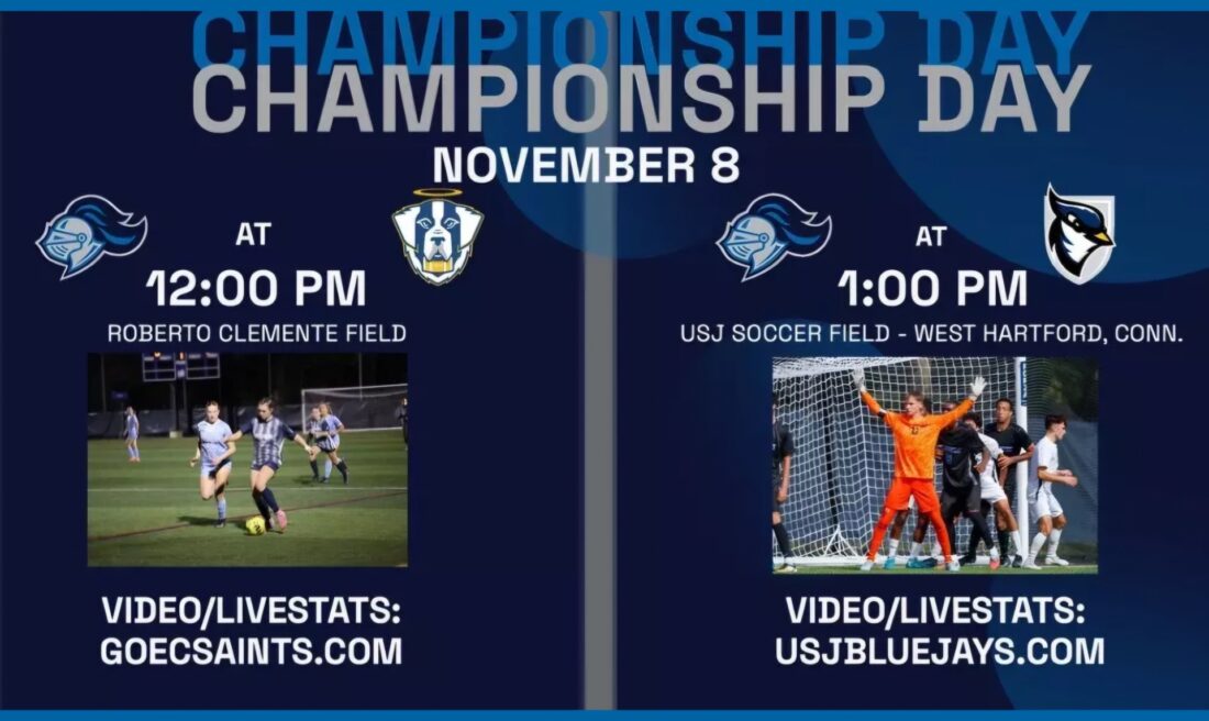 It's a big day for Rivier soccer with the men and women's teams in GNAC title games. (Photo/graphic courtesy of Rivier University)