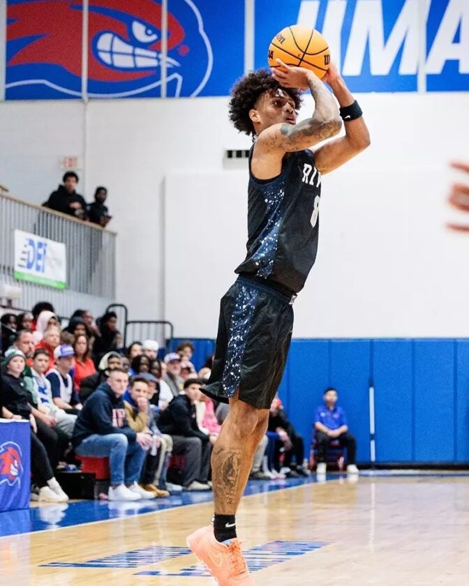 Theo Briscoe IV, shown in the preseason, led the Raiders with 25 points vs. JWU on Monday night. (Courtesy photo by Nick Grace/Rivier Athletics)