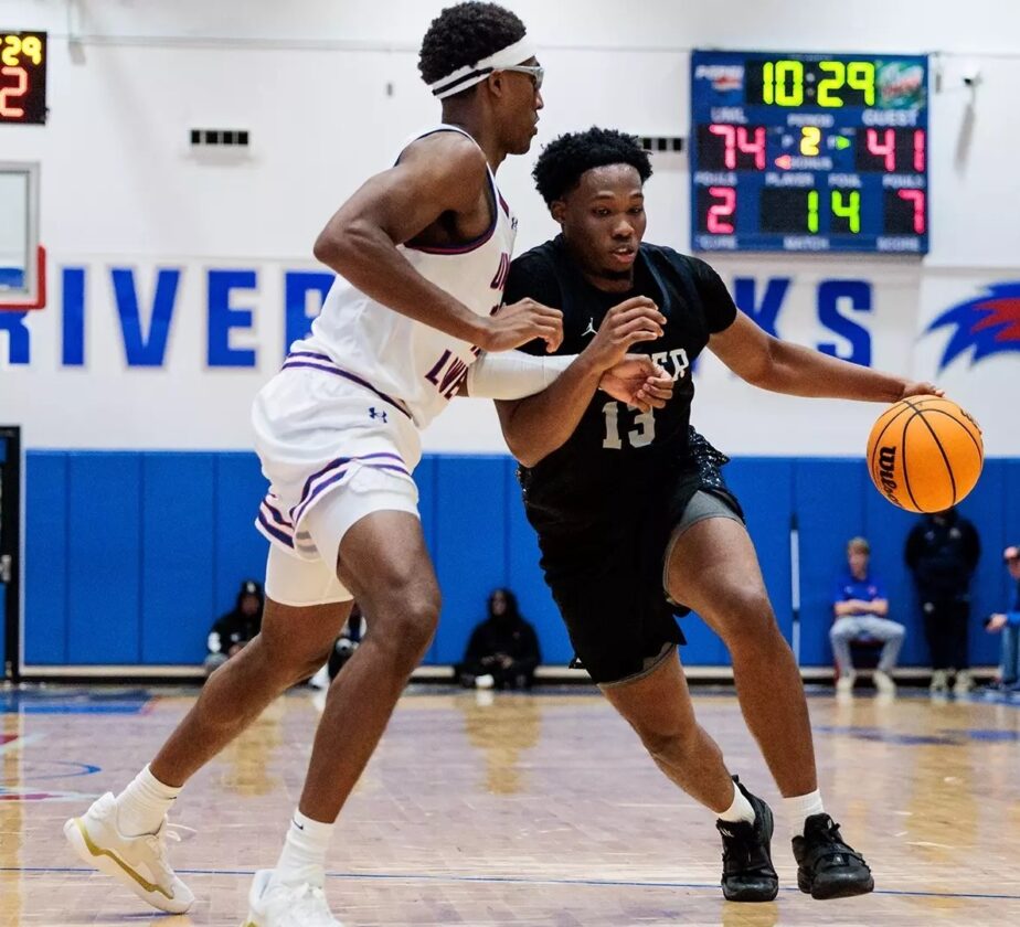 Izaiah Shaw-Glen, shown driving in the preseason, led Rivier with 24 points at Salvae Regina on Thursday night. (Photo courtesy of Rivier Athletics)