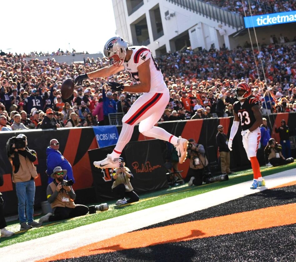 Patriots tight end Hunter Henry celebrates his touchdown during Sunday's win over the Bengals in Cincinnati. (AP photo)