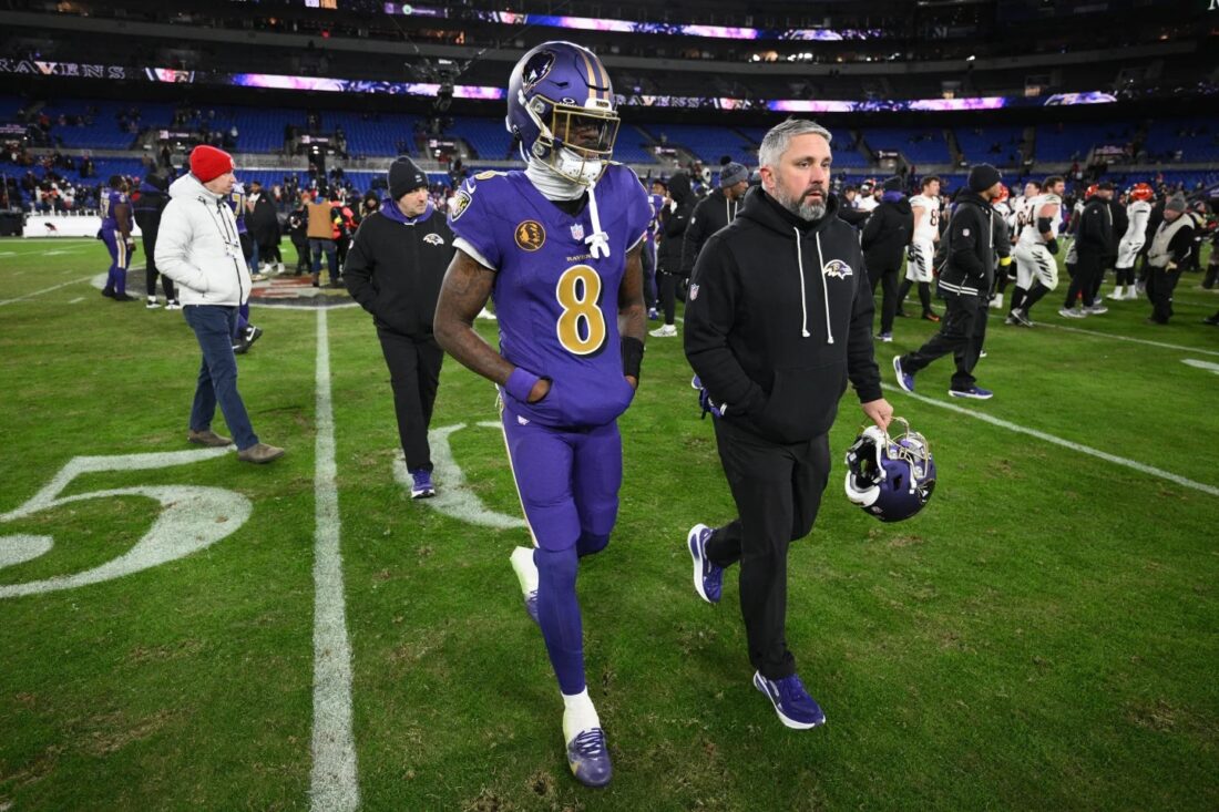 Baltimore's Lamar Jackson walks off the ield in Baltimore after a home loss vs. the Bengals last month. The Ravens host the Patriots on Sunday night. (AP photo)