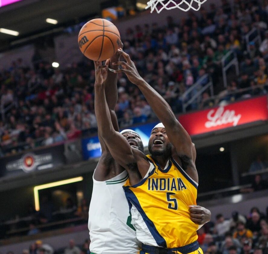 Boston's Neemias Queta battles the Pacers' Jarace Walker for a rebound during Friday night's game in Indianapolis. (AP photo)