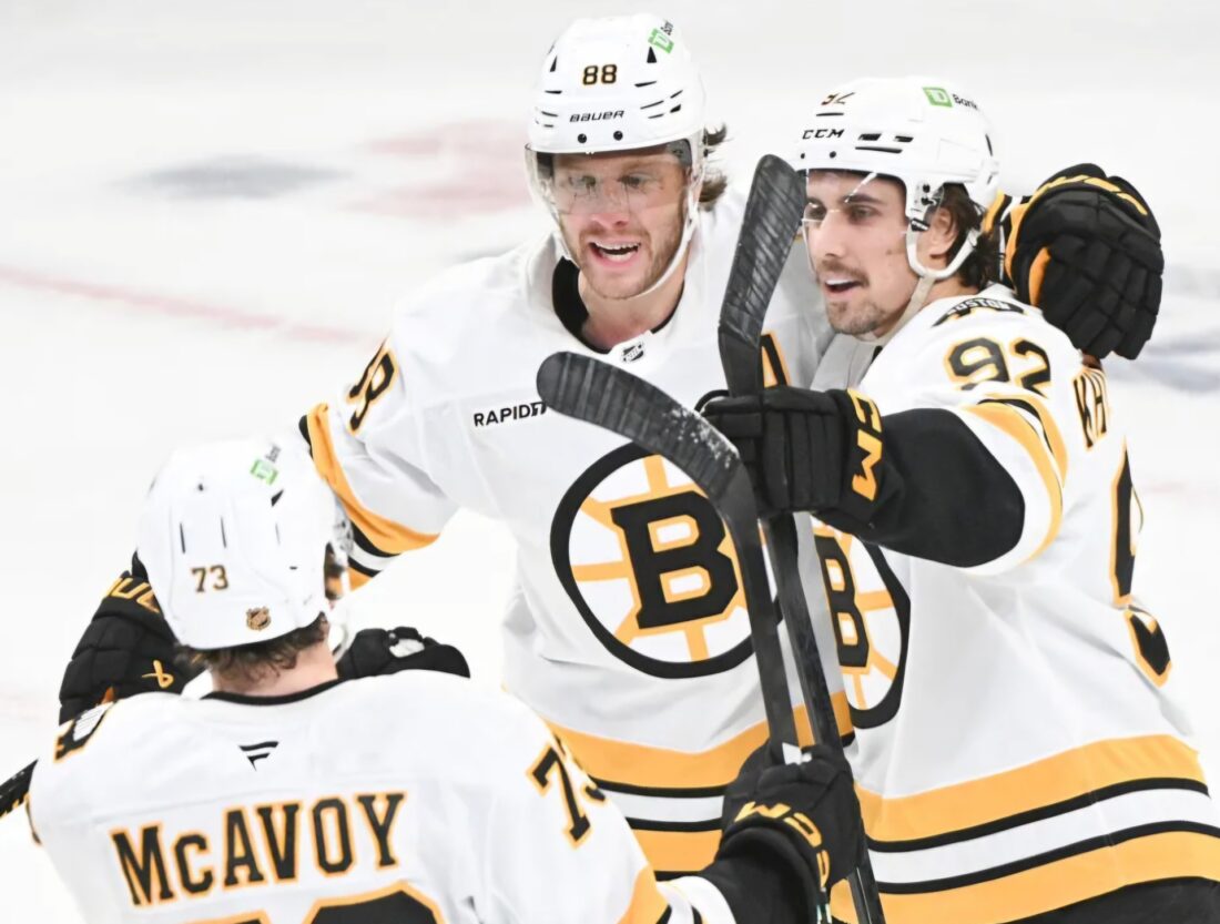 Bruins forward Marat Khusnutdinov (92) celebrates a goal with David Pastrnak and Charlie McAvoy after scoring in the first period of Saturday's rout of the Rangers at TD Garden. (AP photo)