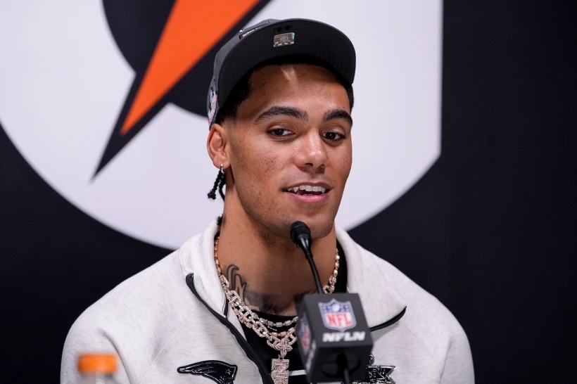Patriots corner Christian Gonzalez answers questions durint Opening Night at the Super Bowl in San Jose on Monday night. (AP photo)