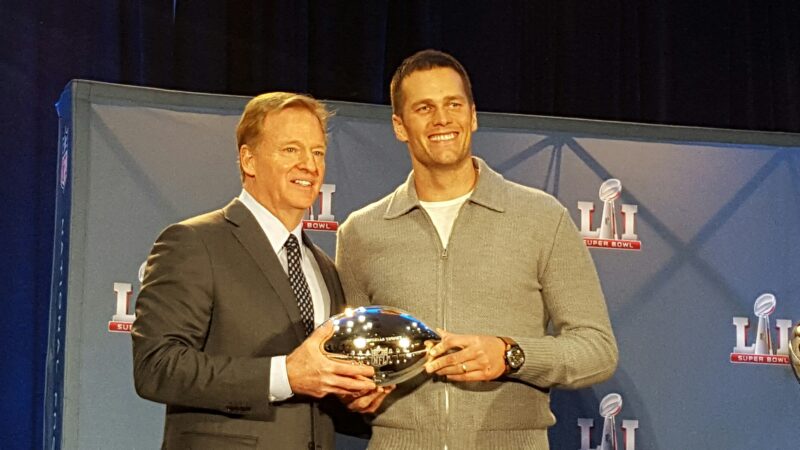 This was Tom Brady’s long awaited Super Bowl MVP press conference with Roger Goodell, who had suspended him for four games that season, after the Patriots beat the Falcons 28-3. It was Brady’s last Super Bowl MVP award as a member of the Patriots. (Telegraph file photo by TOM KING)
