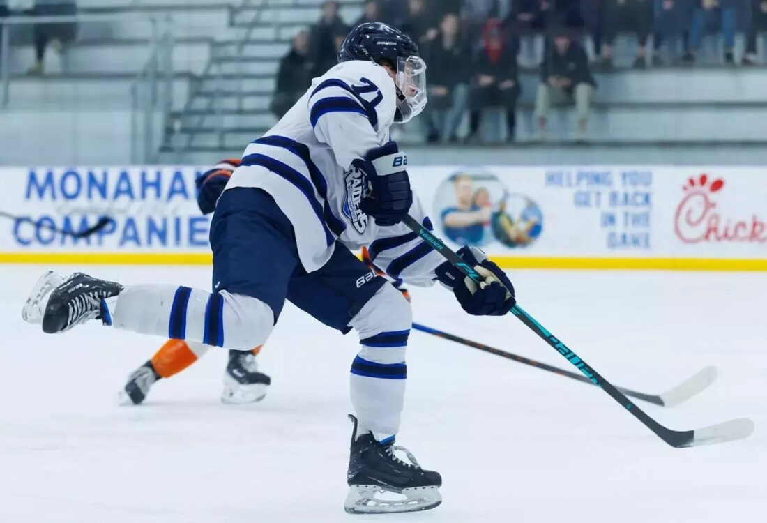 Payton Kender scored the Raiders' lone goal in a 5-1 loss to MCLA Thursday night at Conway Arena. (Courtesy photo by Kyle Prudhomme/Rivier Athletics)