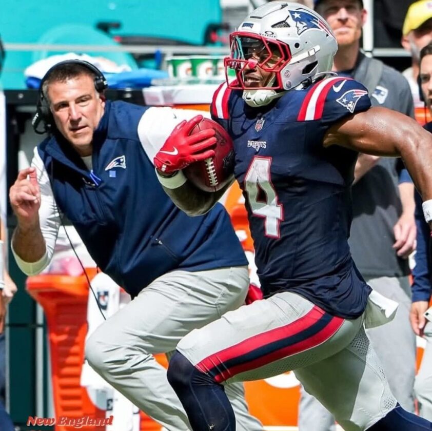 This is the famous shot of Patriots coach Mike Vrabel running on the sidelines with Patriots veteran Antonio Gibson on Gibson's kick return for a TD vs. Miami early in the season. Gibson was released by the Patriots on Monday. (AP photo)