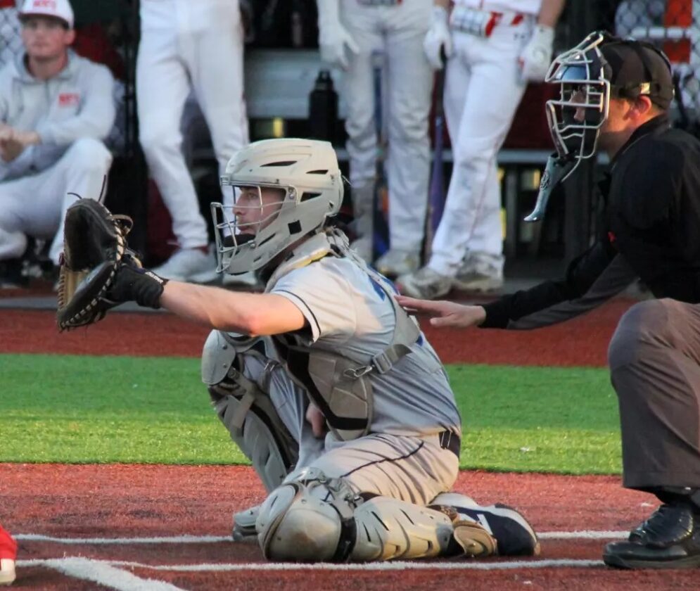 Catcher Dylan Aliberti had four hits in Rivier's 12-11 win over Suffolk in Boston on Tuesday. (Photo courtesy of Rivier Athletics)
