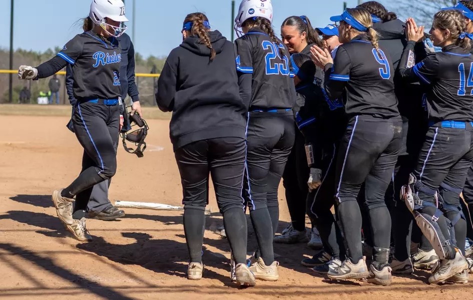 Rivier's Sophia Quinlan, left, is greeted at home plate after hitting a two-run homer during the Raiders' sweep of Regis on Sunday in Weston, Mass. (Photo courtesy of Rivier Athletics)