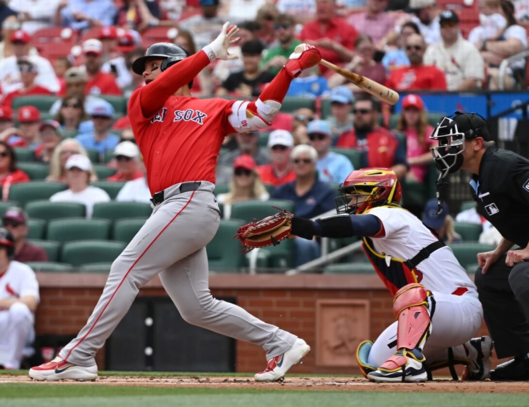 Willson Contreras homes during Boston's 9-3 win over the Cardinals in St. Louis on Sunday. (AP photo)