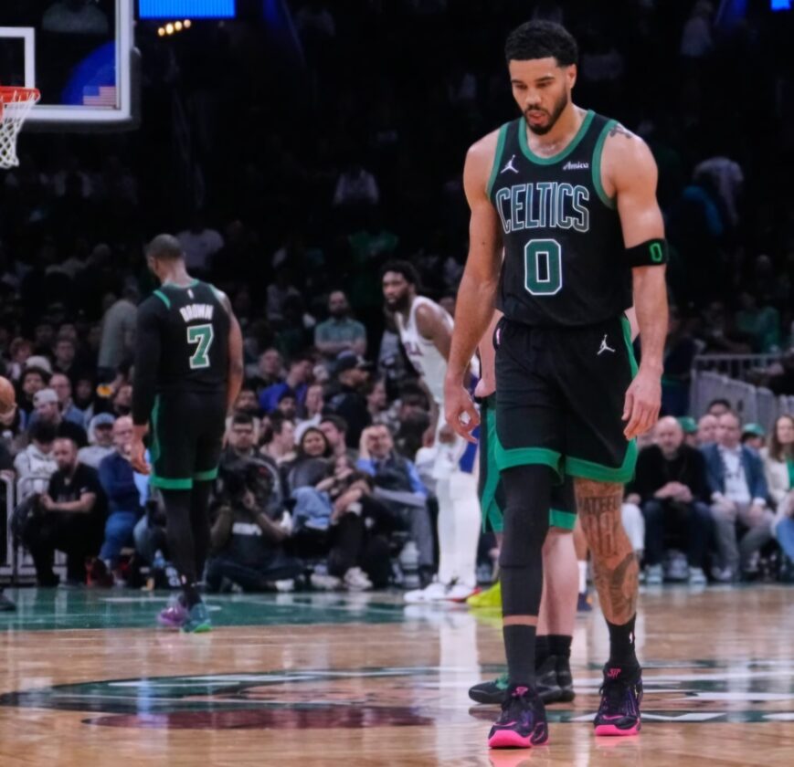 Boston's Jayson Tatum has a dejected look as the Celtics bowed to the Sixers Tuesday night in Game 5 of their Eastern Conferecne first-round series at TD Garden. (AP photo)