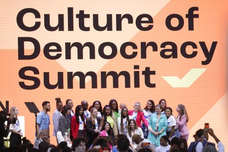 Her speech marked the conclusion of When We All Vote’s inaugural Culture of Democracy Summit. The sparsely attended event was held at a soccer stadium near downtown LA.