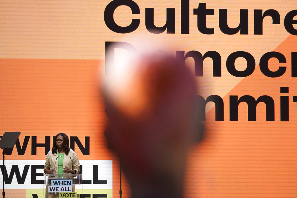 - Former first lady Michelle Obama speaks at the Culture of Democracy Summit in Los Angeles, Monday, June 13, 2022. (AP Photo/Jae C. Hong)