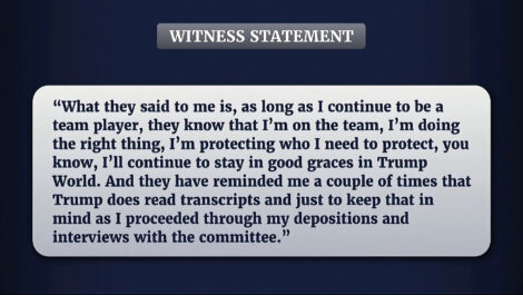 FILE - This exhibit from video released by the House Select Committee, shows witness statement, displayed at a hearing by the House select committee investigating the Jan. 6 attack on the U.S. Capitol, Tuesday, June 28, 2022, on Capitol Hill in Washington. The Jan. 6 congressional hearings have paused, at least for now, and Washington is taking stock of what was learned about the actions of Donald Trump and associates surrounding the Capitol attack. (House Select Committee via AP, File)