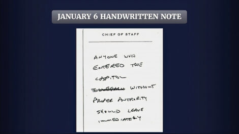 FILE - This exhibit from video released by the House Select Committee, shows handwritten note by Cassidy Hutchinson, former aide to Trump White House chief of staff Mark Meadows, displayed at a hearing by the House select committee investigating the Jan. 6 attack on the U.S. Capitol, June 28, 2022, on Capitol Hill in Washington. The Jan. 6 congressional hearings have paused, at least for now, and Washington is taking stock of what was learned about the actions of Donald Trump and associates surrounding the Capitol attack.(House Select Committee via AP, File)