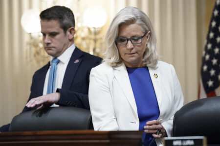 Rep. Adam Kinzinger, R-Ill., left, and Vice Chair Liz Cheney, R-Wyo., arrive as the House select committee investigating the Jan. 6 attack on the U.S. Capitol holds a hearing at the Capitol in Washington, Thursday, July 21, 2022. The Jan. 6 congressional hearings have paused, at least for now, and Washington is taking stock of what was learned about the actions of Donald Trump and associates surrounding the Capitol attack.(AP Photo/J. Scott Applewhite)