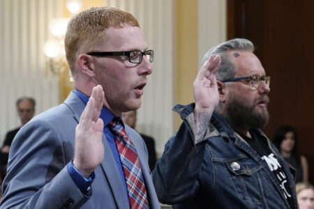 Stephen Ayres, who pleaded guilty in June 2022 to disorderly and disruptive conduct in a restricted building, left, and Jason Van Tatenhove, an ally of Oath Keepers leader Stewart Rhodes, right, are sworn in to testify as the House select committee investigating the Jan. 6 attack on the U.S. Capitol holds a hearing at the Capitol in Washington, Tuesday, July 12, 2022. The Jan. 6 congressional hearings have paused, at least for now, and Washington is taking stock of what was learned about the actions of Donald Trump and associates surrounding the Capitol attack. (AP Photo/J. Scott Applewhite)