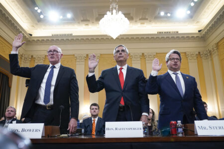 FILE - Rusty Bowers, Arizona state House Speaker, from left, Brad Raffensperger, Georgia Secretary of State, and Gabe Sterling, Georgia Deputy Secretary of State, are sworn in to testify as the House select committee investigating the Jan. 6 attack on the U.S. Capitol holds a hearing at the Capitol in Washington, June 21, 2022. The Jan. 6 congressional hearings have paused, at least for now, and Washington is taking stock of what was learned about the actions of Donald Trump and associates surrounding the Capitol attack. (AP Photo/Jacquelyn Martin, File)