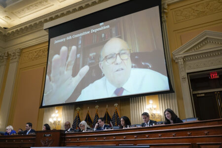 FILE - A video deposition from Rudy Giuliani is shown as the House select committee investigating the Jan. 6 attack on the U.S. Capitol holds a hearing at the Capitol in Washington, July 12, 2022. The Jan. 6 congressional hearings have paused, at least for now, and Washington is taking stock of what was learned about the actions of Donald Trump and associates surrounding the Capitol attack. (AP Photo/J. Scott Applewhite, File)
