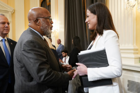 FILE - Chairman Bennie Thompson, D-Miss., talks with Cassidy Hutchinson, former aide to Trump White House chief of staff Mark Meadows, after she testified as the House select committee investigating the Jan. 6 attack on the U.S. Capitol held a hearing at the Capitol in Washington, June 28, 2022. The Jan. 6 congressional hearings have paused, at least for now, and Washington is taking stock of what was learned about the actions of Donald Trump and associates surrounding the Capitol attack.(AP Photo/J. Scott Applewhite, File)
