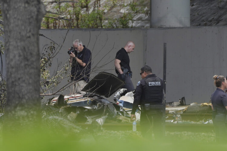 BOCA RATON, Fla. (AP) — Three people were killed and one was injured when a small plane crashed Friday morning in South Florida near a major interstate highway and pushed a car onto railroad tracks, officials said.