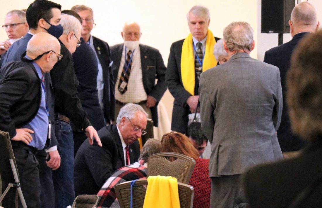 (Courtesy of DAN TUOHY via Twitter) State legislators surround state Rep. Ralph Boehm, Republican of Litchfield, after he collapsed to the floor during Gov. Chris Sununu's State of the State address Thursday. Boehm had reportedly regained consciousness when medical personnal arrived, and was transported to a local hospital.