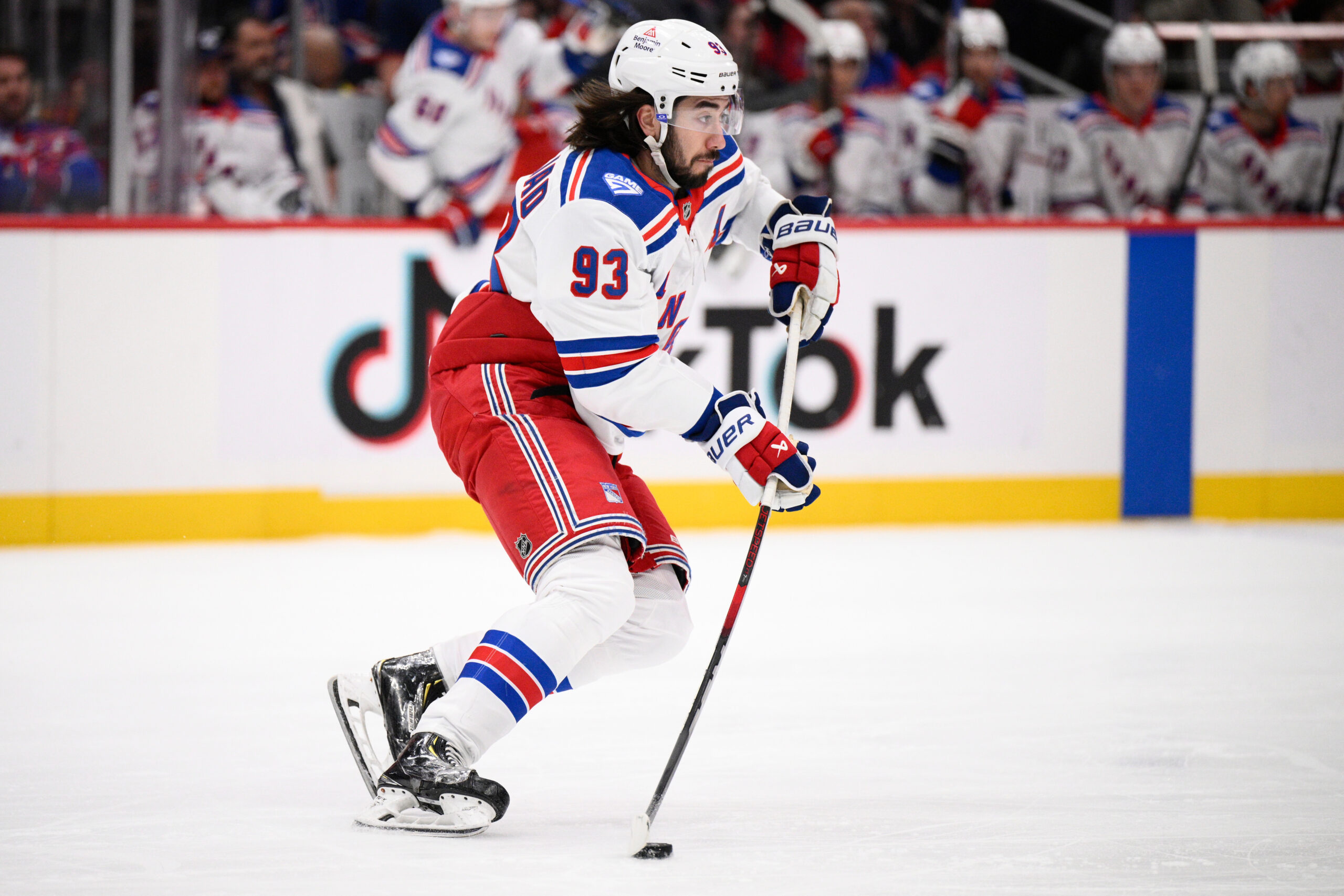 New York Rangers center Mika Zibanejad (93) skates with the puck during the first period of an NHL hockey game against the Washington Capitals, Tuesday, Dec. 23, 2025, in Washington. (AP Photo/Nick Wass)