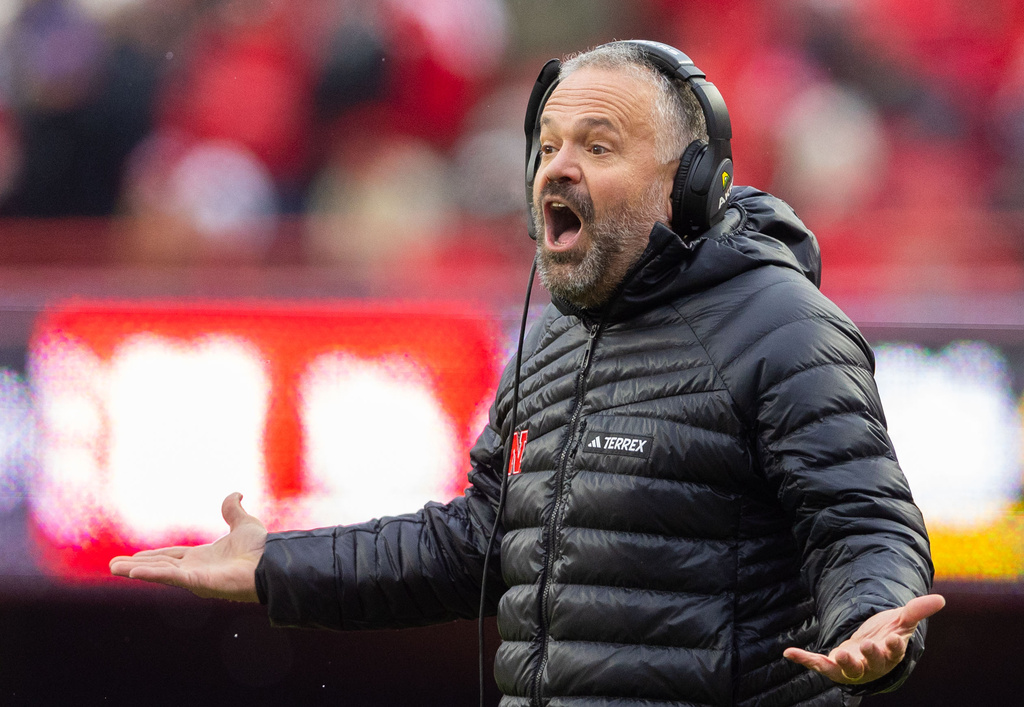 FILE - Nebraska head coach Matt Rhule disputes a referee's call after Nebraska made a safety against Iowa during the second half of an NCAA college football game Friday, Nov. 28, 2025, in Lincoln, Neb. (AP Photo/Rebecca S. Gratz, File)