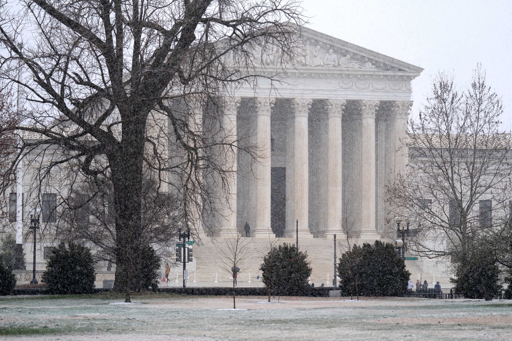The U.S. Supreme Court as seen during a snowy day on Capitol Hill Thursday, March 12, 2026, in Washington. (AP Photo/Jose Luis Magana)